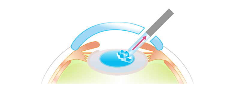 ストローのような吸引管を挿入し、水晶体(レンズ)を超音波で破壊し吸引する(超音波水晶体摘出術)