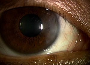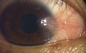 翼状片は結膜の組織が多くは横から角膜内に侵入してくるものです。充血を伴っていることも多く、「見栄えが悪い」といった悩みが多いようです。この他「目がごろごろする」症状もあり、進行して角膜の中央に近づくと乱視が進行するなどの理由から視力が低下してきます。