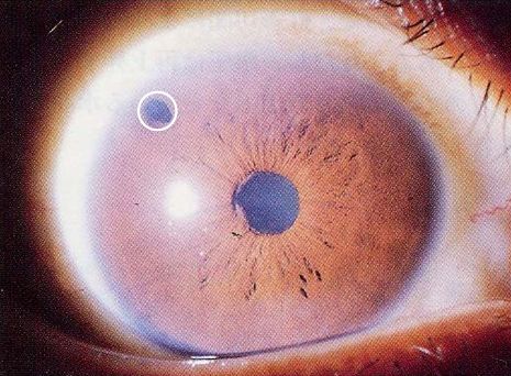 レーザーのあと(丸囲み)が見られる