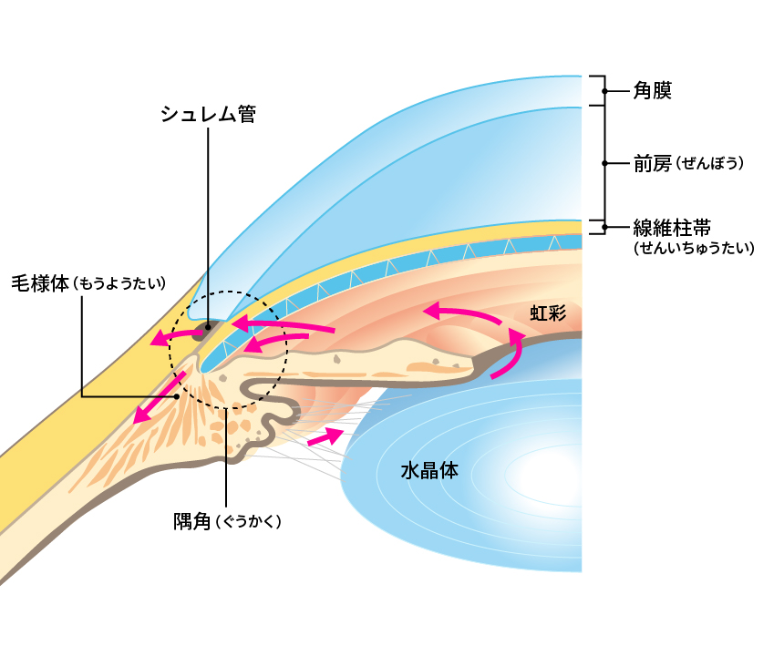 緑内障は、治る病気ではないことから、一度治療が始まると生涯を通じて治療が必要です。治療は、点眼薬による眼圧下降治療がメインです。点眼薬には房水の産生量を減らす、または流出量を増やす薬物があり、まずは単剤そして、病状により働きの違う薬物を併用します。点眼薬で効果が足りない場合、また急性の変化で強力な効果が必要な場合には、内服や点滴を行います。