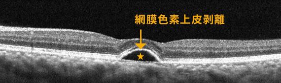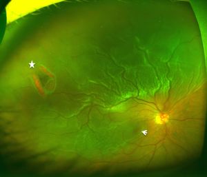 裂孔(星)と剥がれている黄斑(矢印)