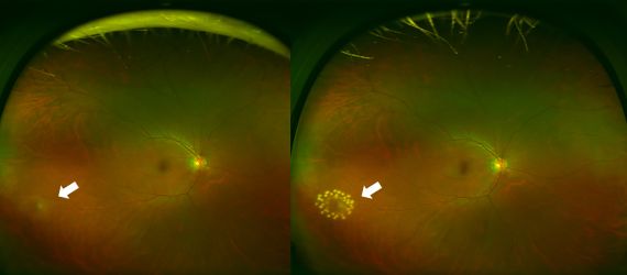 図8網膜裂孔(左)と光凝固後(右)