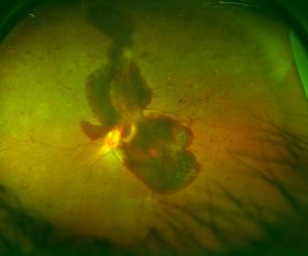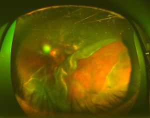 新生血管からできた増殖膜(白い部分)とその周囲に牽引性網膜剥離が見られる