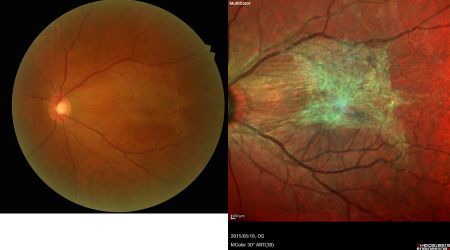 通常の眼底カメラ(左)に比べてマルチカラー撮影(右)では黄斑上膜が鮮明に写っている