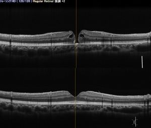 黄斑円孔の手術前(上)と手術後(下)。円孔は閉鎖し視力は0.2から1.2に回復した