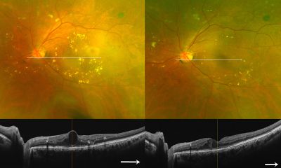 治療前(左)に較べ、光凝固後(右)は浮腫や硬性白斑が減少している