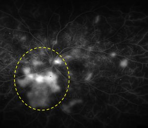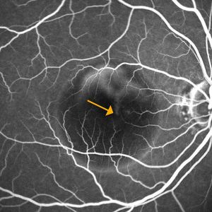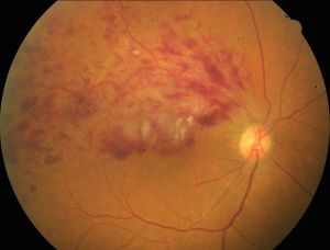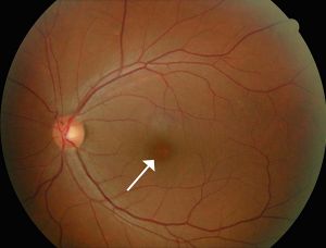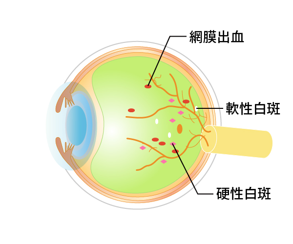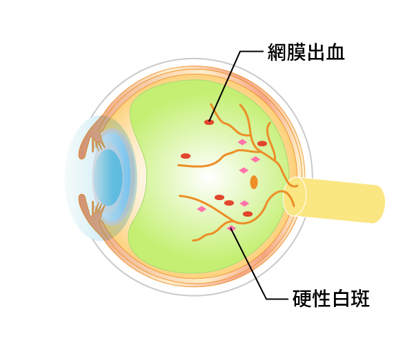 実際には網膜に小さな出血や毛細血管瘤という異常が見られる時期です。視力は網膜の中心部の黄斑の機能で決まるため、ほとんどの場合は症状がありません。