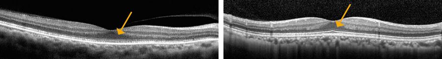 黄斑円孔前(左)と後部硝子体剥離がうまく起こらずに生じた黄斑円孔(右)