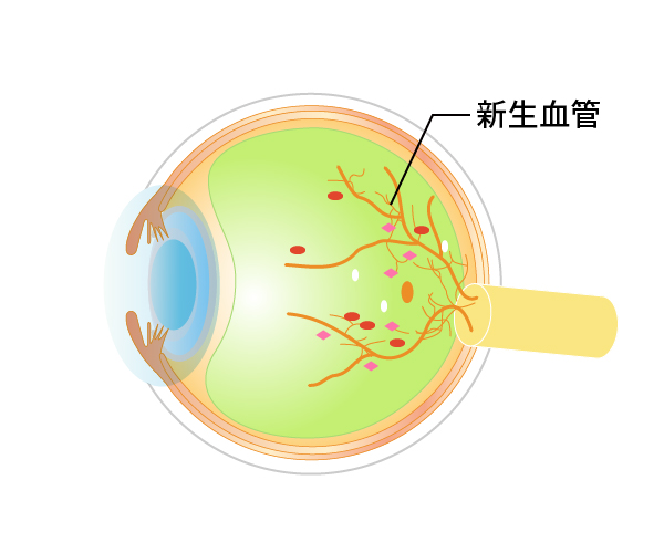 血管がつまった場所の網膜は栄養不足で機能が低下します。さらには栄養不足に陥った網膜はいろいろな悪い因子も放出します。その主なものにVEGF(血管内皮増殖因子)といったものがあり、VEGFに反応して網膜の血管から新生血管という異常血管が発生したり、血管からの水漏れをさらに増やしたりします。