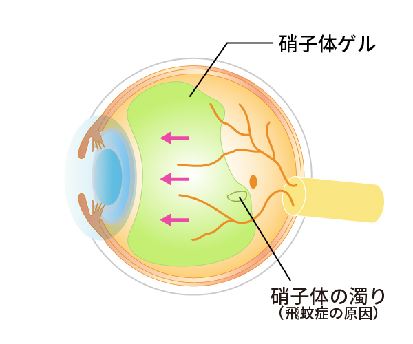 人間は加齢により老化が進行しますが、目も例外ではありません。眼球の中心部には硝子体(しょうしたい)というゲル状の物質(硝子体ゲル)がつまっています(図1)。魚の目玉などにも入っているトロトロとしたものです。ところがこの硝子体ゲルは、加齢により少しずつ減少していきます。硝子体ゲルが減ってくると、その隙間には液化硝子体というさらさらの水に置き換わっていきます(図2)。そしてあるところまで進行するとある日突然、硝子体ゲルは網膜から離れて前方に移動していきます(図3)。これが「後部硝子体剥離」という現象です。後部硝子体剥離が起こると硝子体ゲルが目の動きと共に大きく動くことになります。そこで、もともとあった硝子体の中の濁りが、網膜に動く影となって写ります。これが後部硝子体剥離による飛蚊症(ひぶんしょう)です。こういった加齢性の変化が網膜剥離(もうまくはくり)や黄斑円孔(おうはんえんこう)、糖尿病網膜症(とうにょうびょうもうまくしょう)、硝子体黄斑牽引症候群(しょうしたいおうはんけんいんしょうこうぐん)、黄斑上膜(おうはんじょうまく)、硝子体出血(しょうしたいしゅっけつ)などの病気と大きく関係しています。