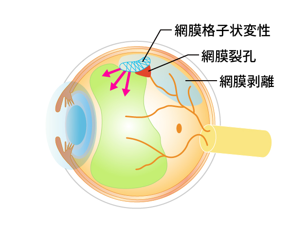 網膜剥離とは網膜が目の壁から剥がれた(離れた)状態のことで、網膜は目の壁から栄養をもらっているので、剥がれた網膜は見る力を失っていきます。①網膜にあな(裂孔)ができてそこから液化硝子体が網膜の下に入ってできるもの(裂孔原性網膜剥離)と、②裂孔のないもの(滲出性網膜剥離、牽引性網膜剥離)があります。